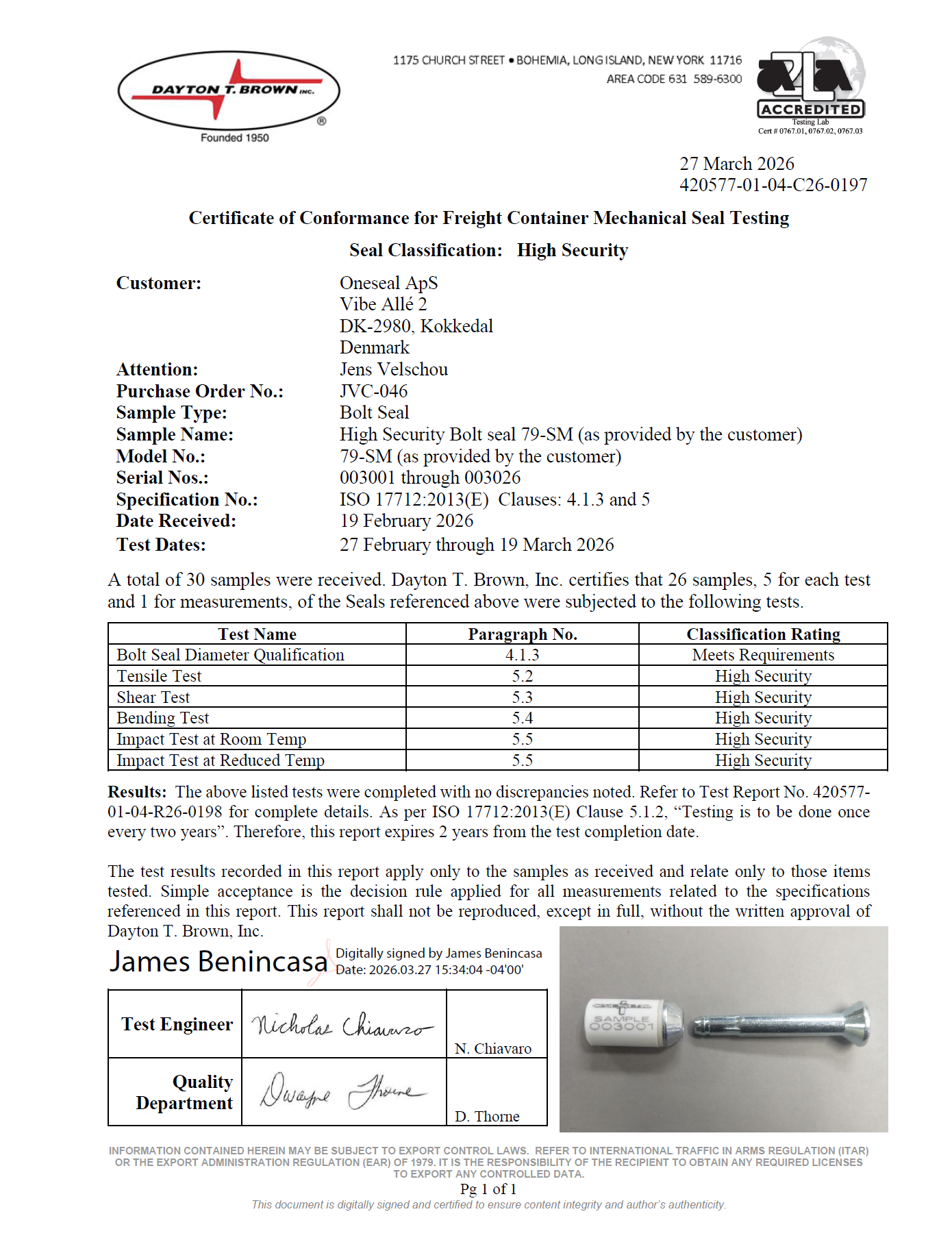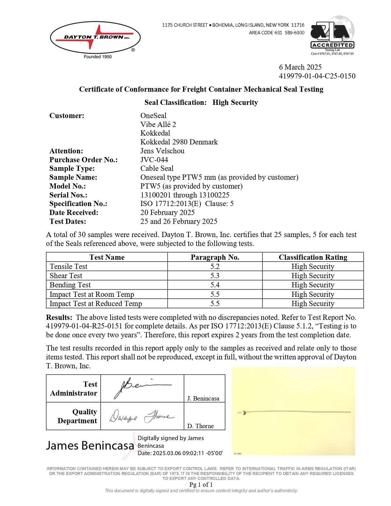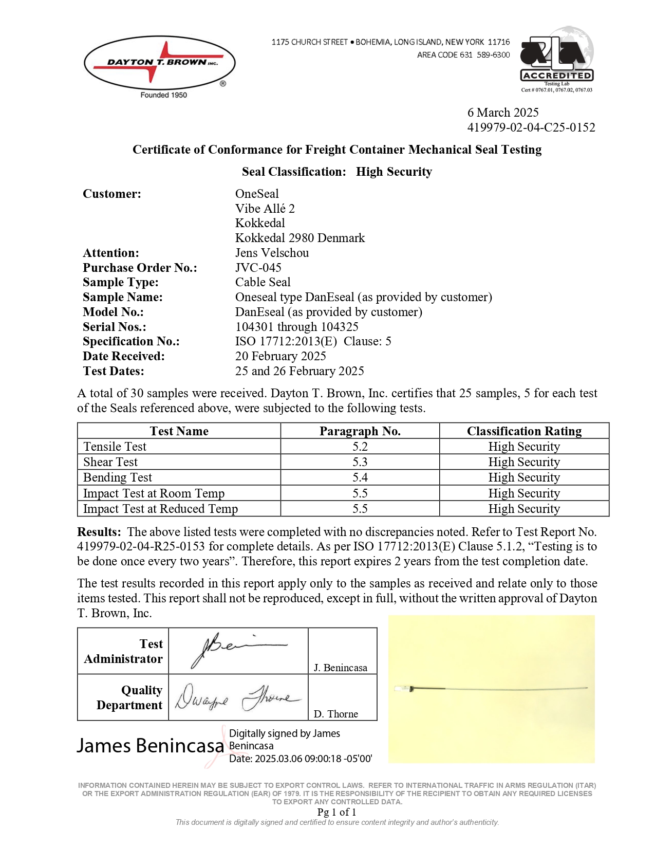 OneSeal Certificates ISO 17712:2013 - HIGH SECURITY BOLTSEAL 79-T06 ISO 17712:2013 - HIGH SECURITY BOLT SEAL 79-SM ISO 17712:2013 - HIGH SECURITY DANESEAL ESEAL ISO 17712:2013 - HIGH SECURITY CABLE SEAL PTW 5.0 ISO 17712:2013 - HIGH SECURITY CABLE SEAL OK-4 ISO17712:2013 CLAUSE 6 ISO9001:2015